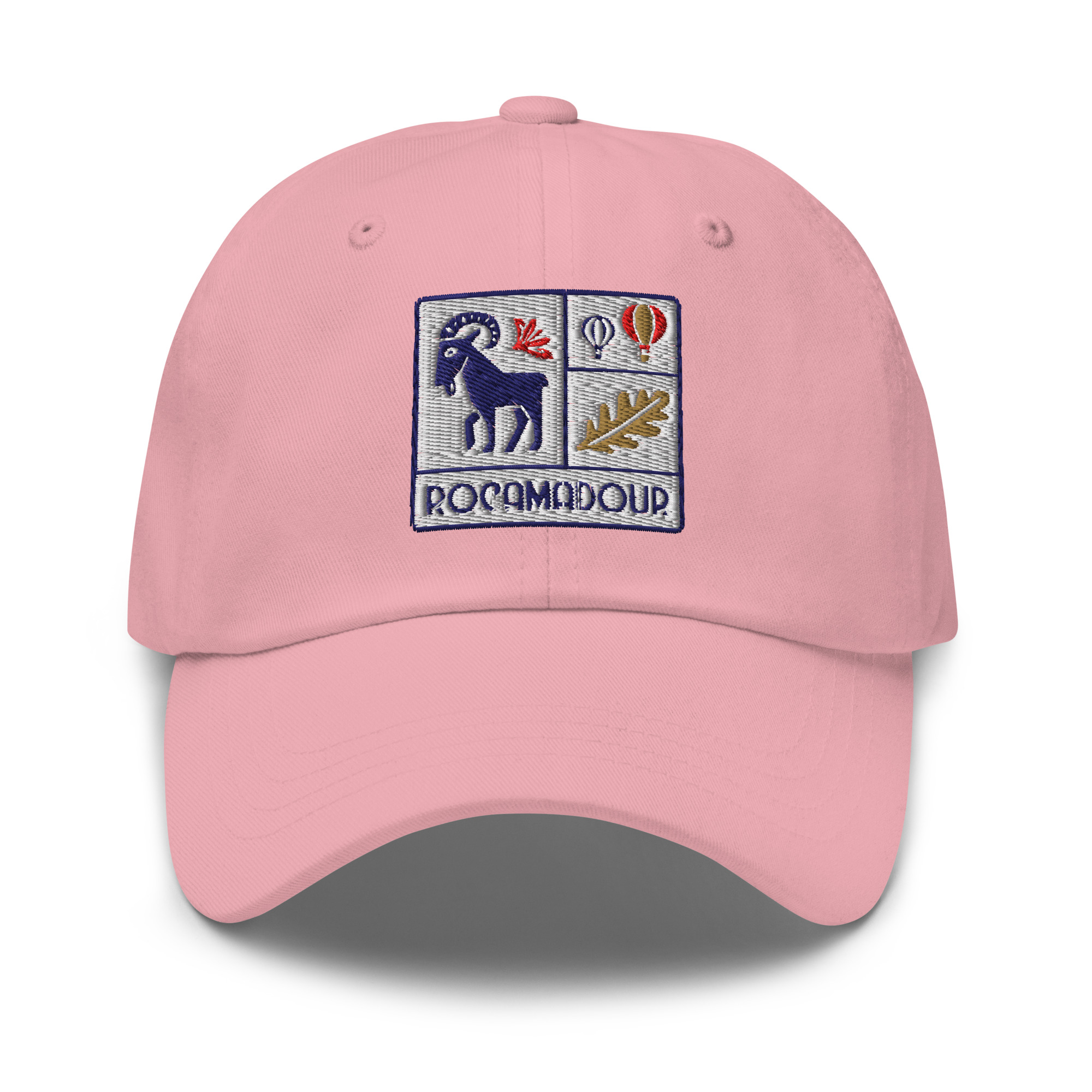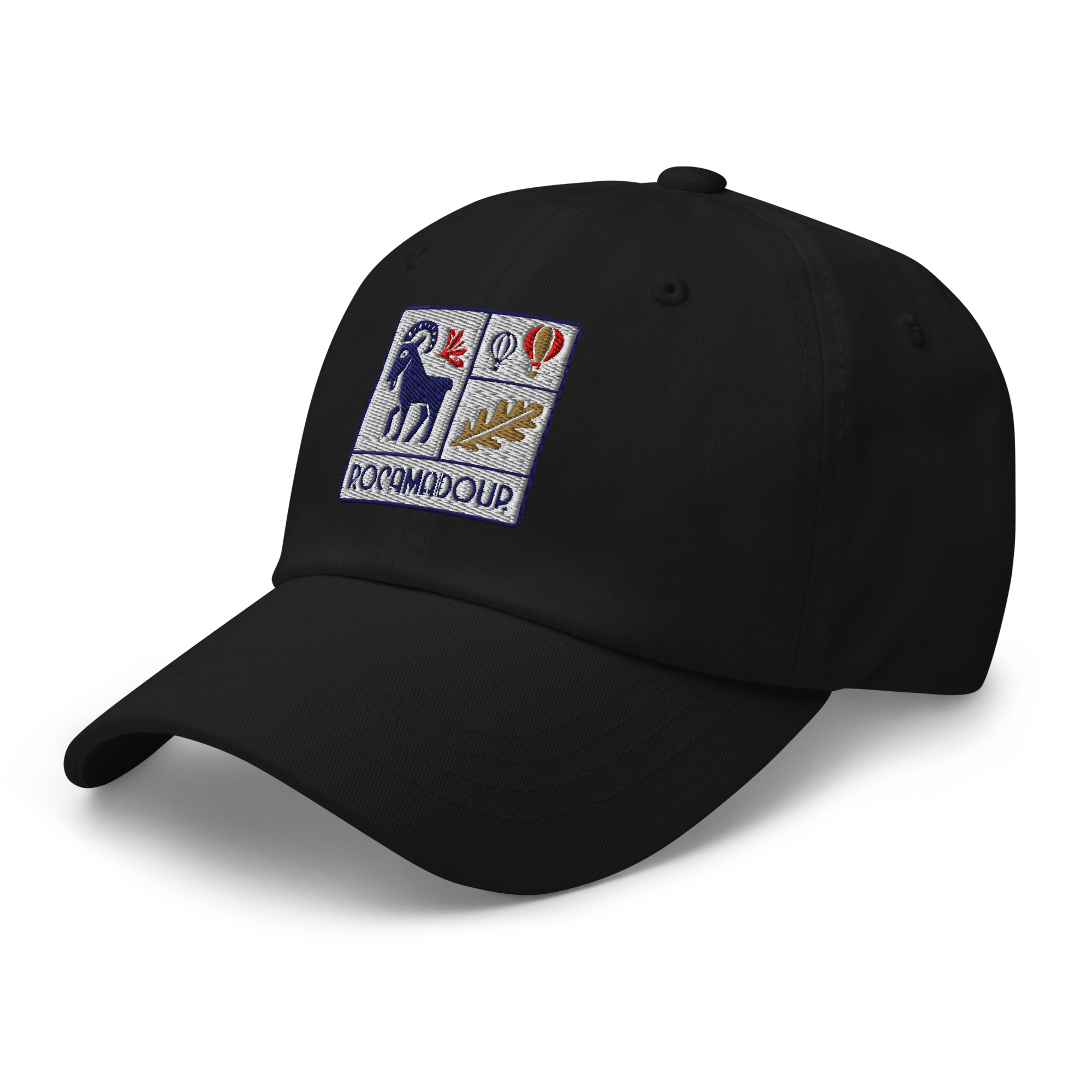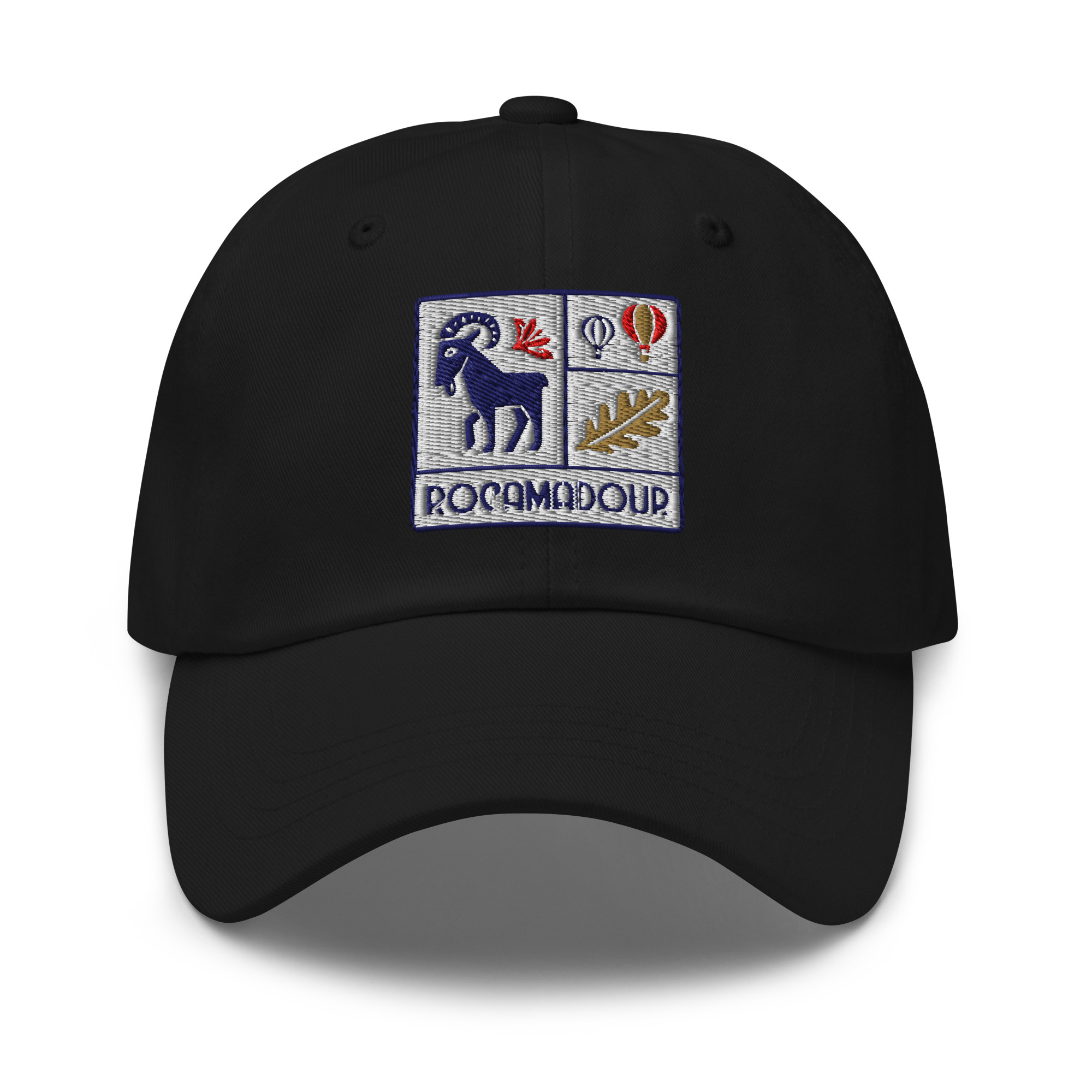 Ce visuel rassemble les symboles de Rocamadour (Lot, Occitanie) : pèlerin de Saint-Jacques-de-Compostelle, chèvre du Quercy, Vierge noire, singe de la Forêt des Singes, aigle du Rocher des Aigles et montgolfières des Montgolfiades. Composition inspirée des motifs artisanaux.