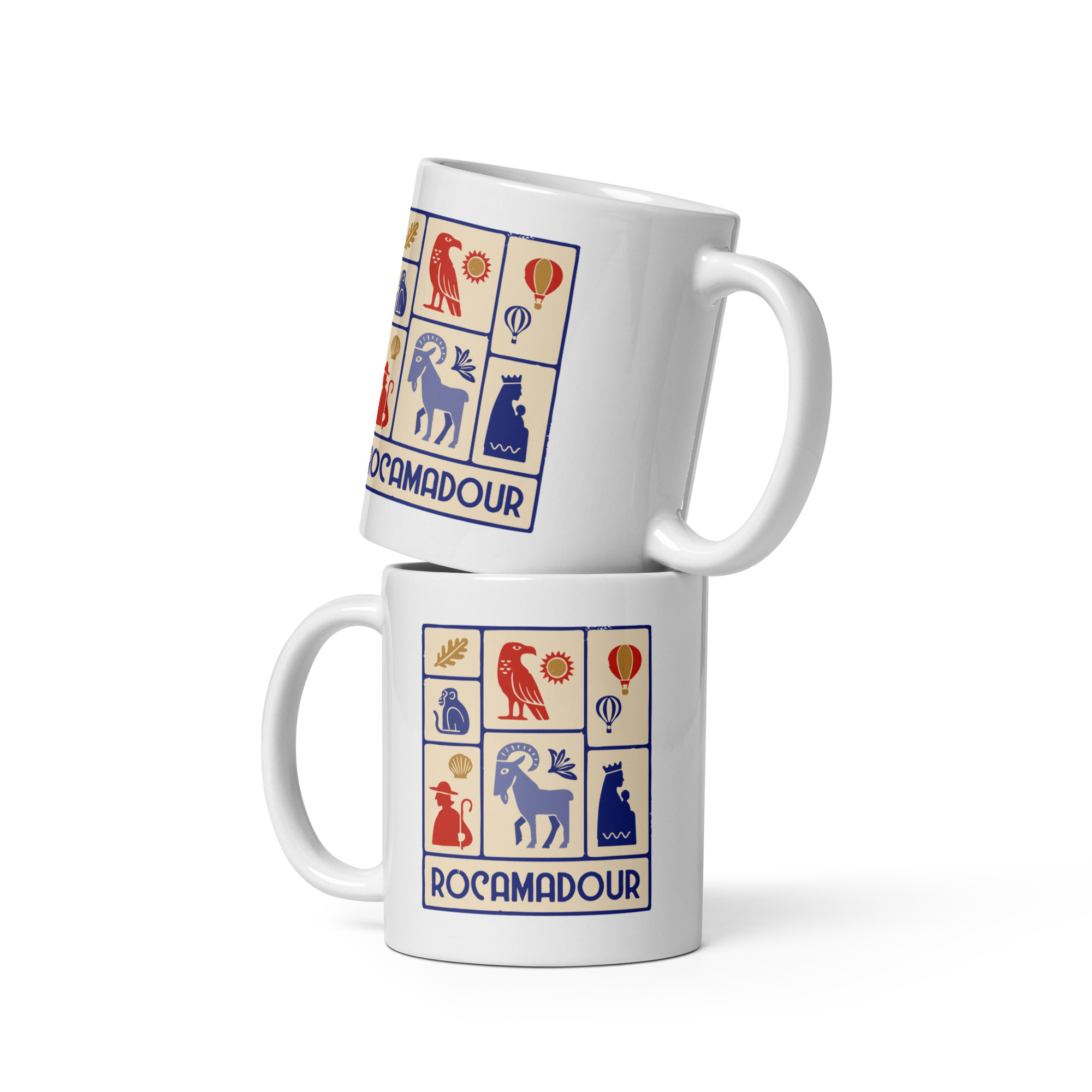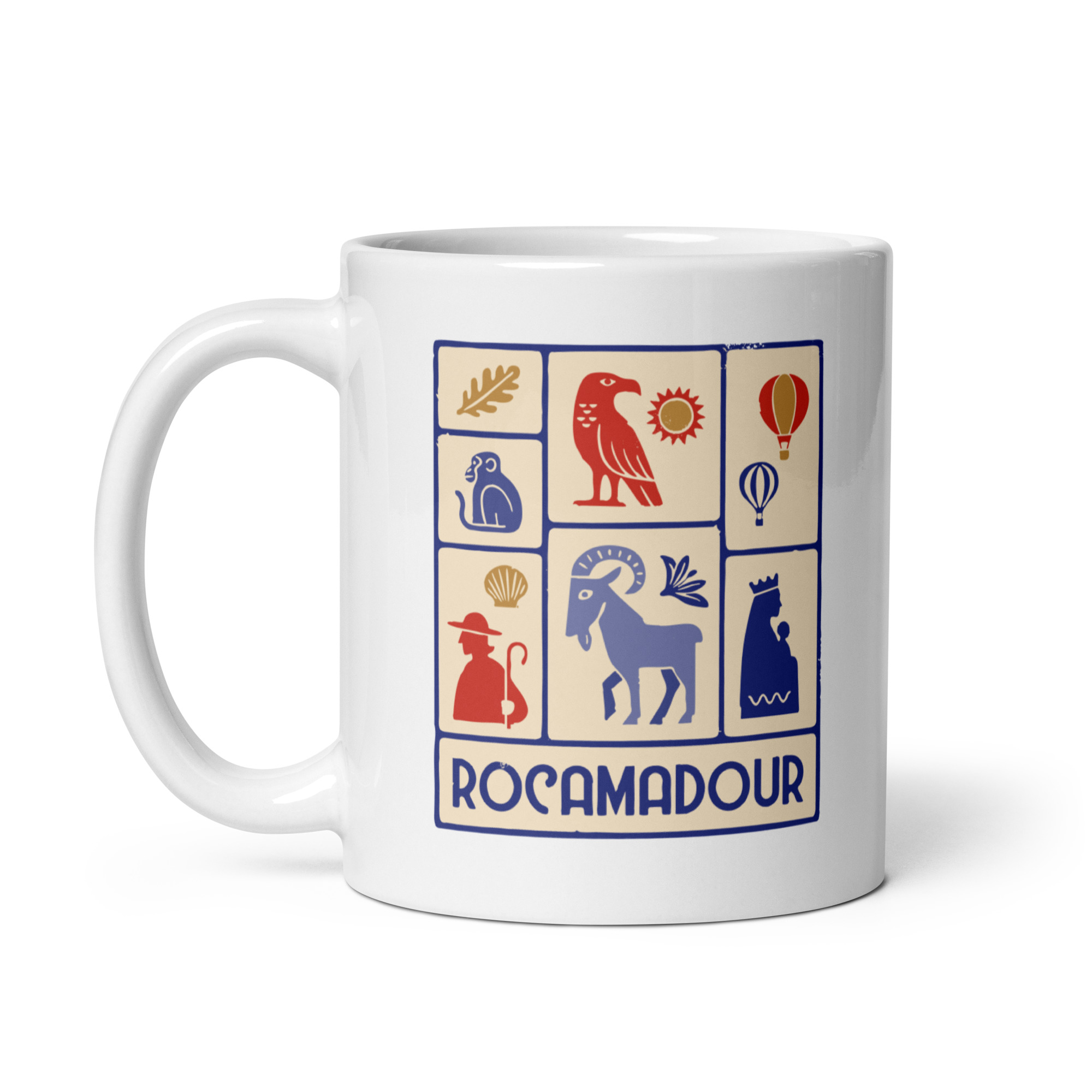Ce visuel rassemble les symboles de Rocamadour (Lot, Occitanie) : pèlerin de Saint-Jacques-de-Compostelle, chèvre du Quercy, Vierge noire, singe de la Forêt des Singes, aigle du Rocher des Aigles et montgolfières des Montgolfiades. Composition inspirée des motifs artisanaux.