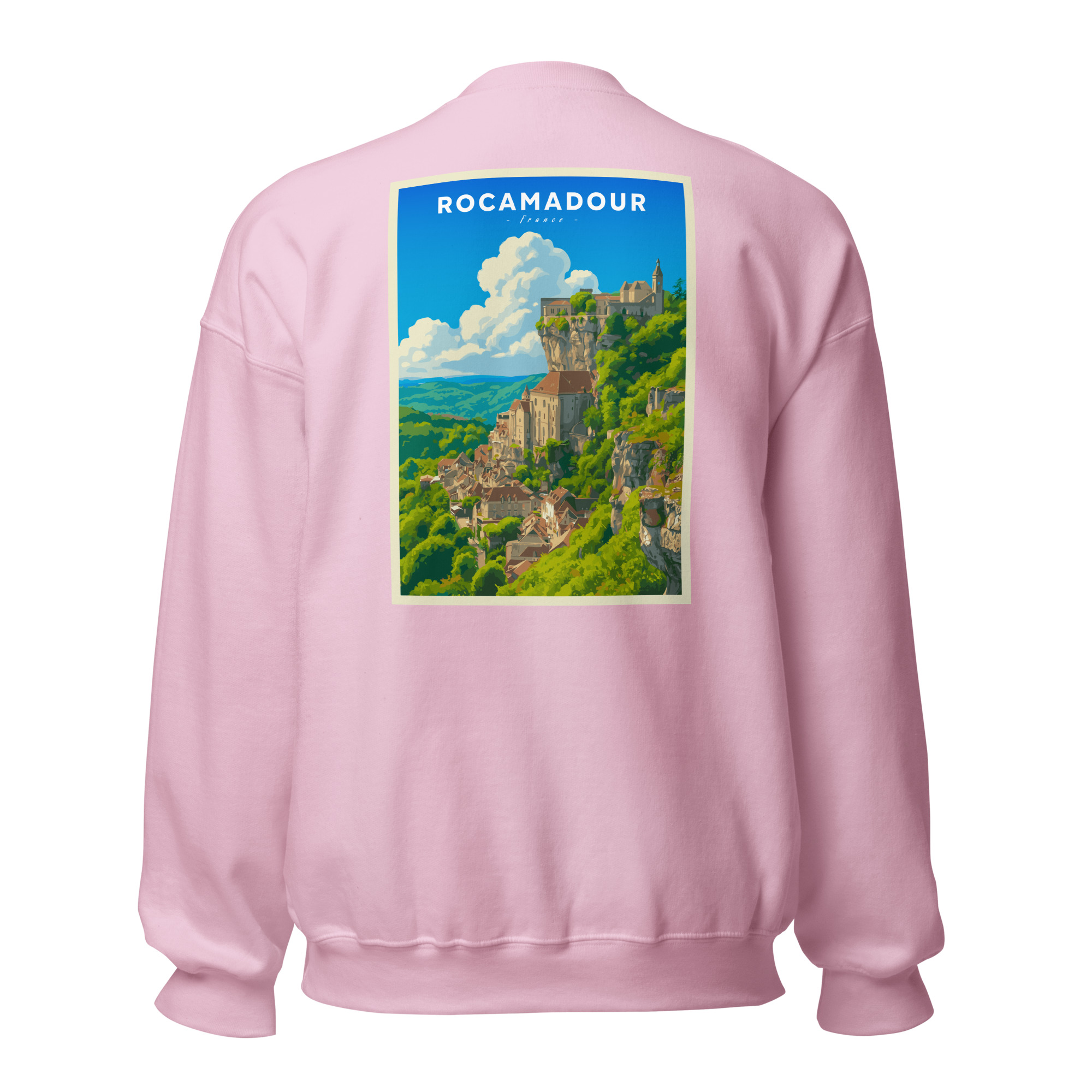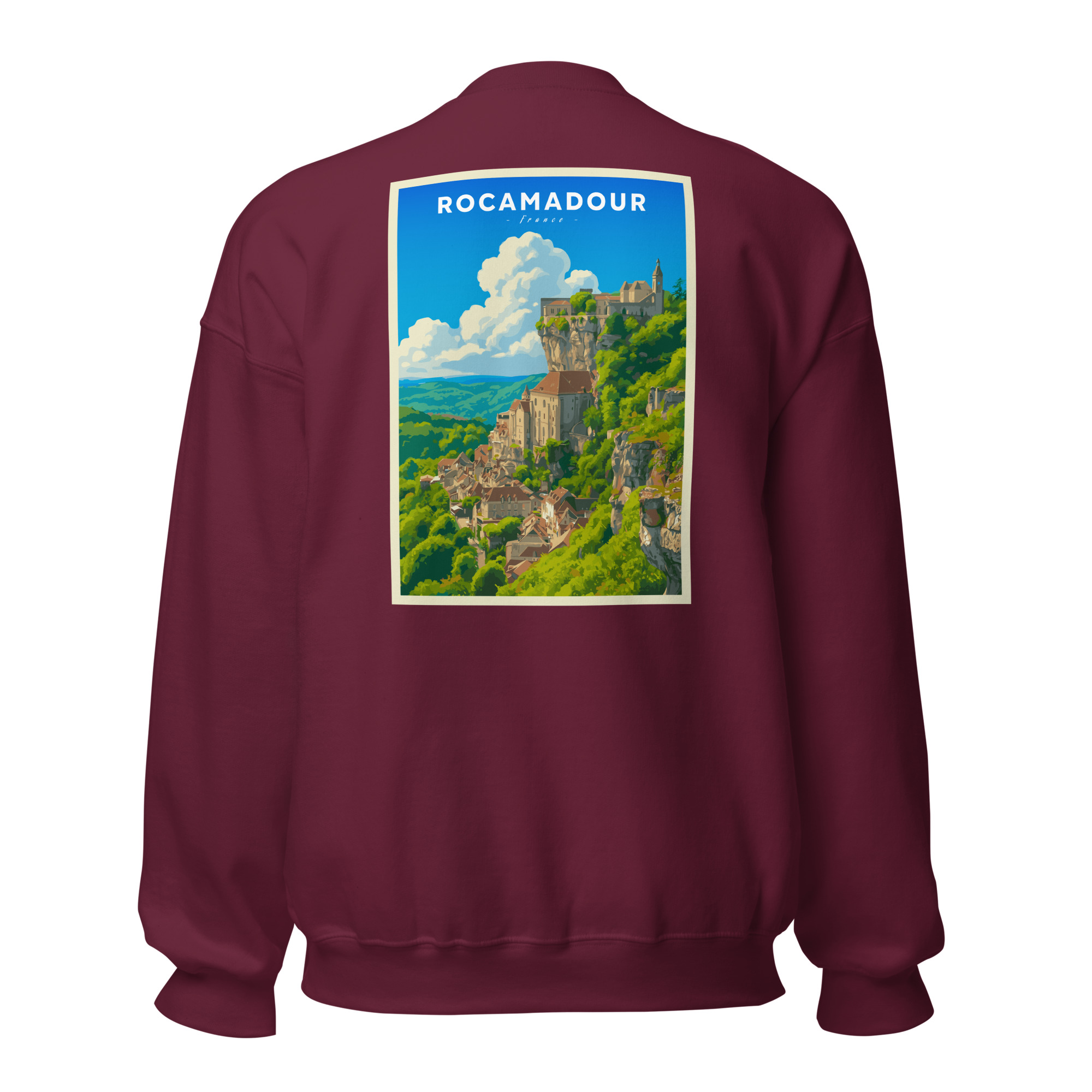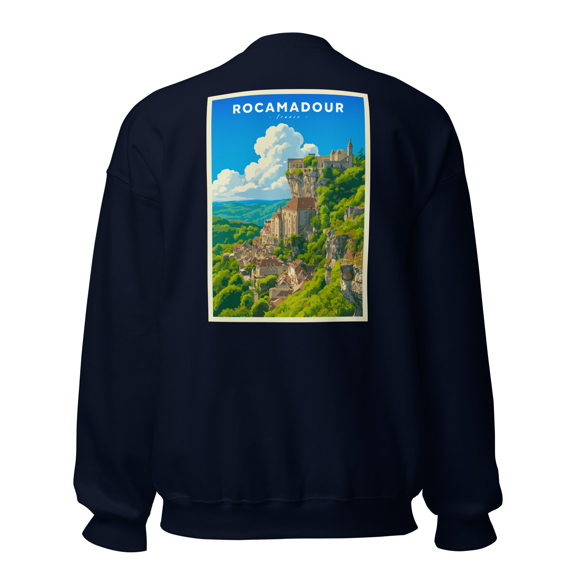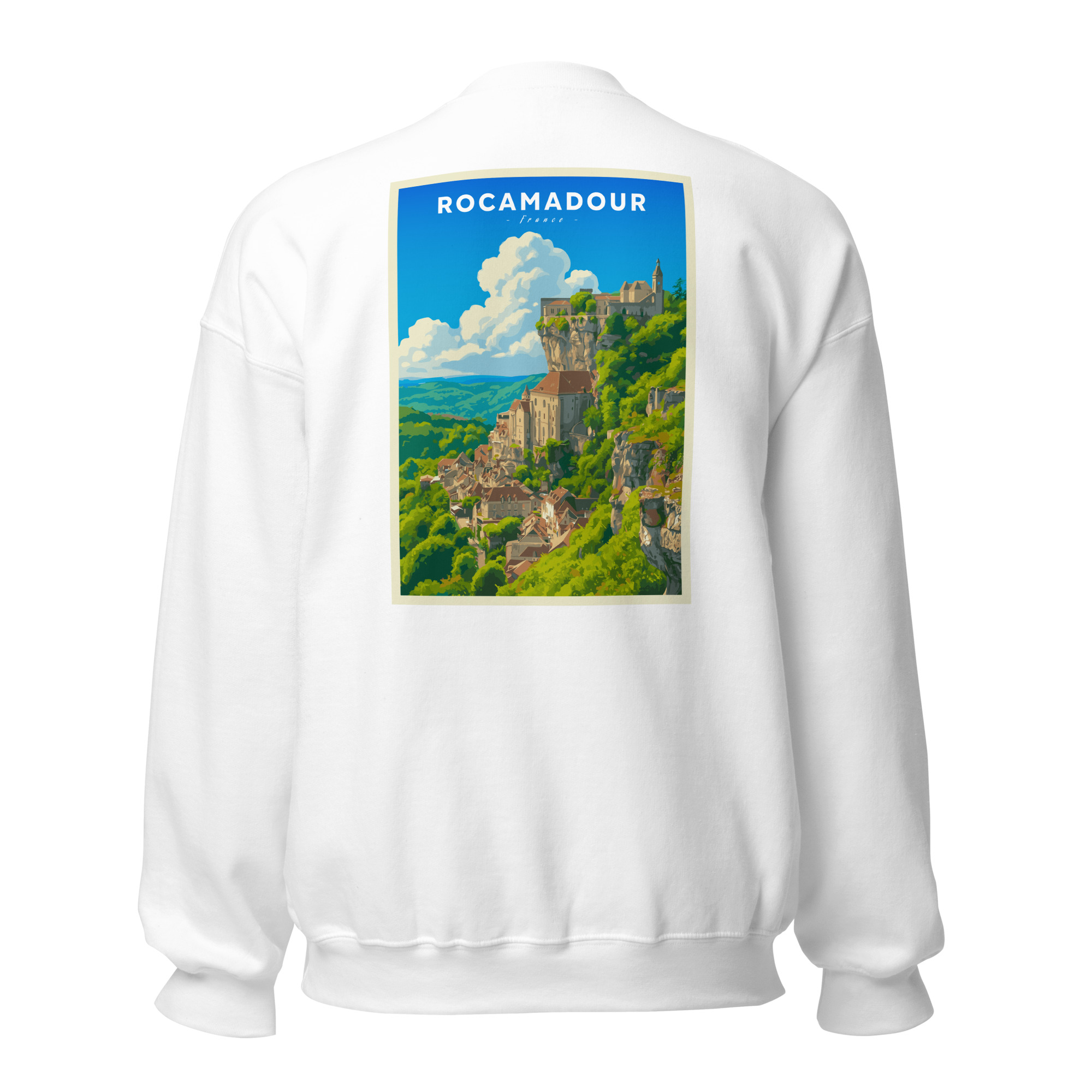 Ce visuel capture toute la majesté de Rocamadour, perché sur sa falaise surplombant la vallée de l’Alzou. Son style graphique, inspiré des affiches vintage, met en lumière l’un des plus beaux villages du Lot et d’Occitanie, entre nature préservée et patrimoine médiéval.