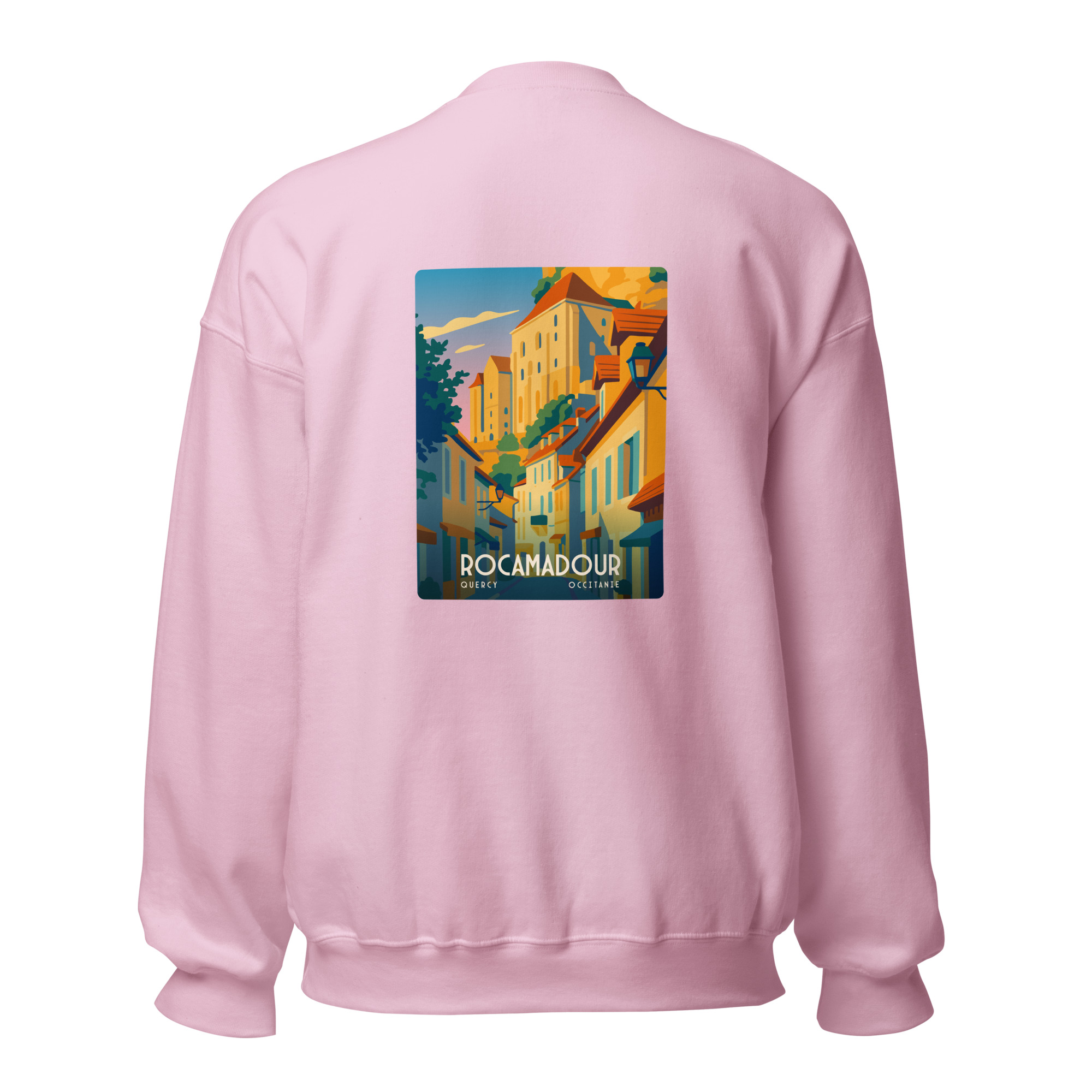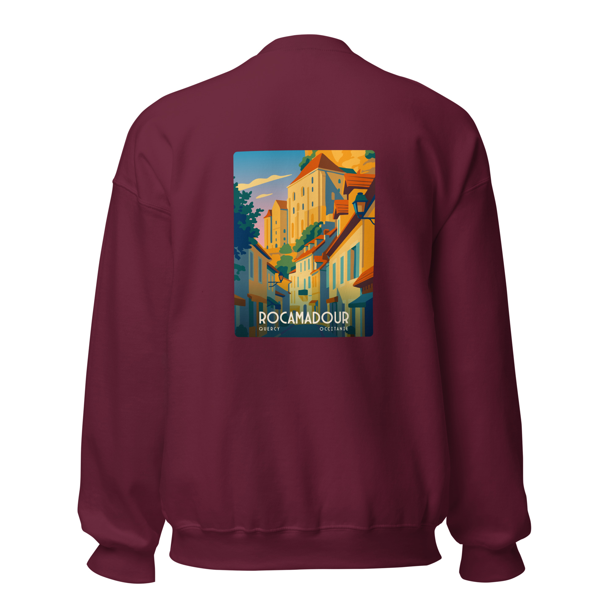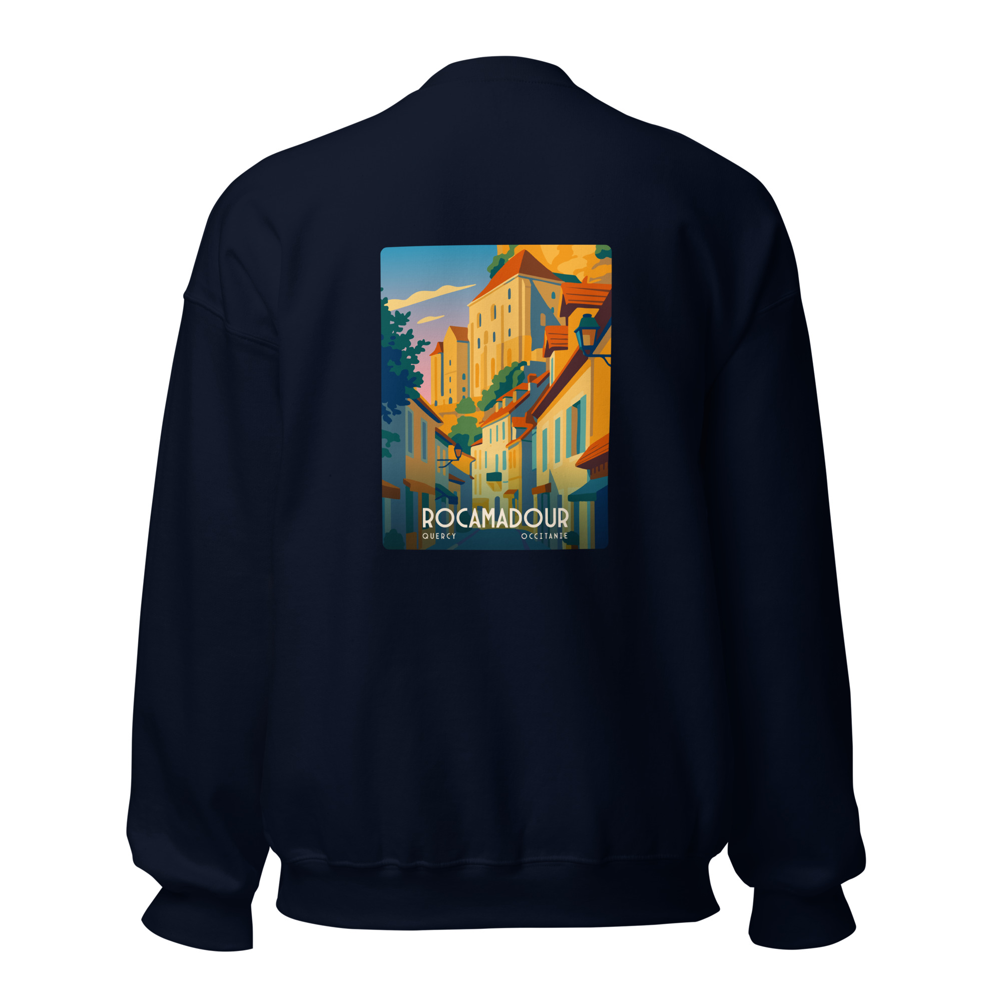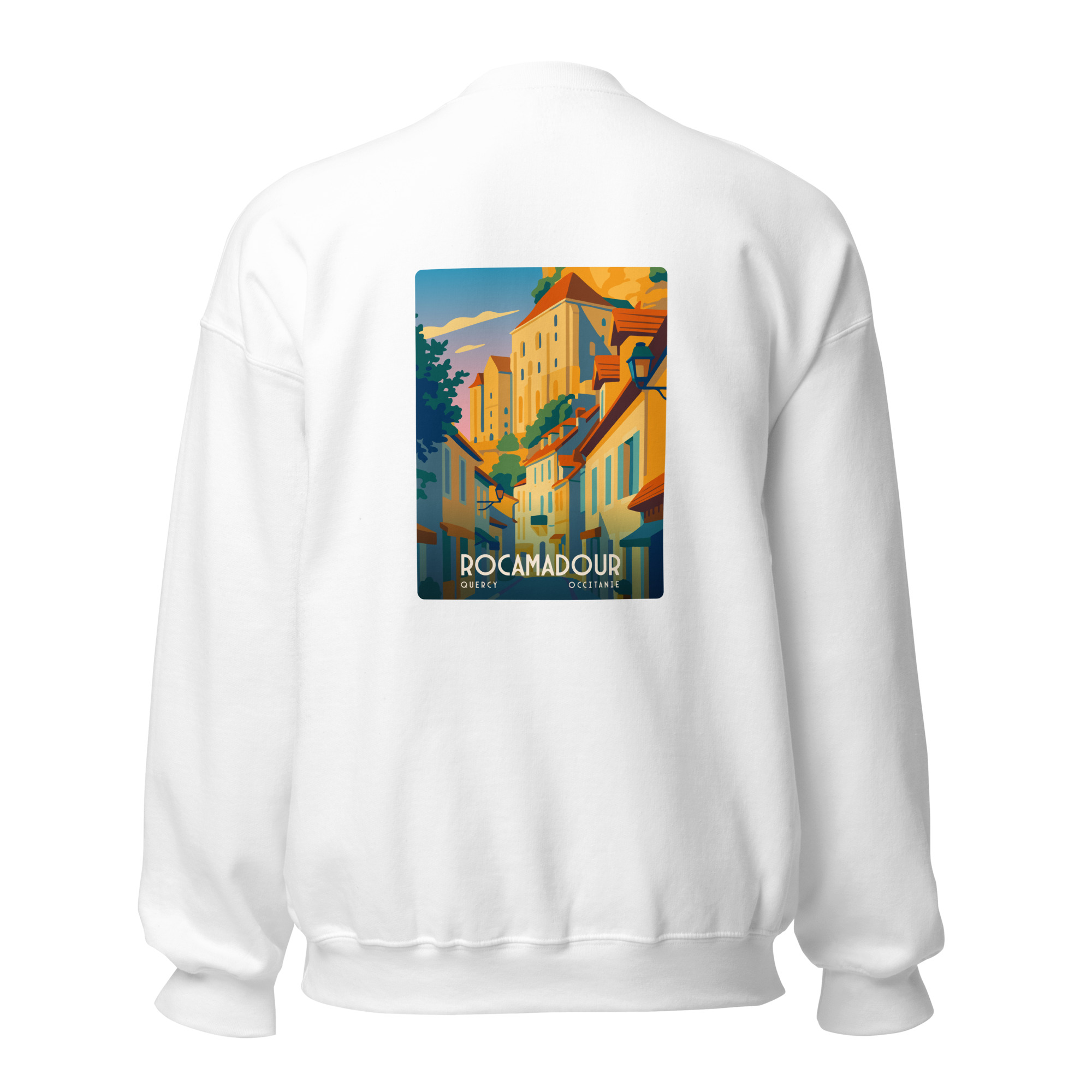 Ce visuel capture l’atmosphère ensoleillée des ruelles de Rocamadour, au cœur du Quercy. Les façades dorées et les toits ocres reflètent la chaleur du Sud-Ouest, tandis que la lumière du soir sublime les pierres typiques du Lot.