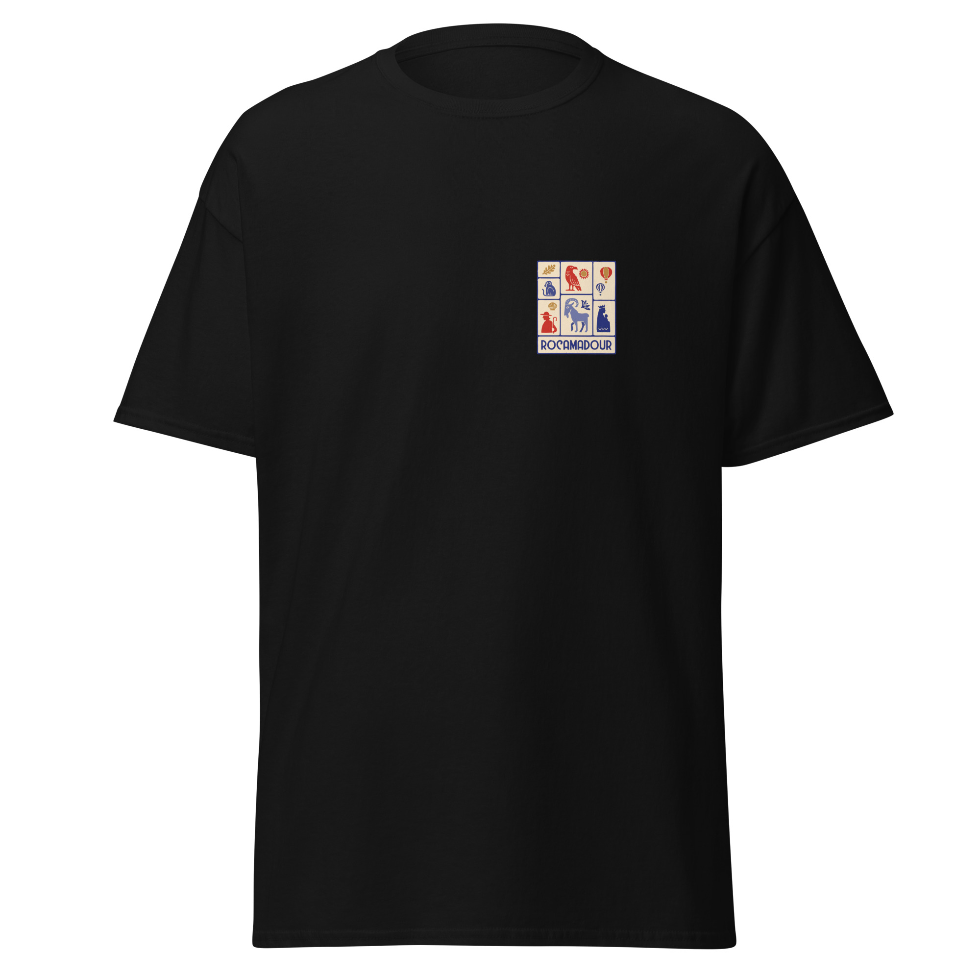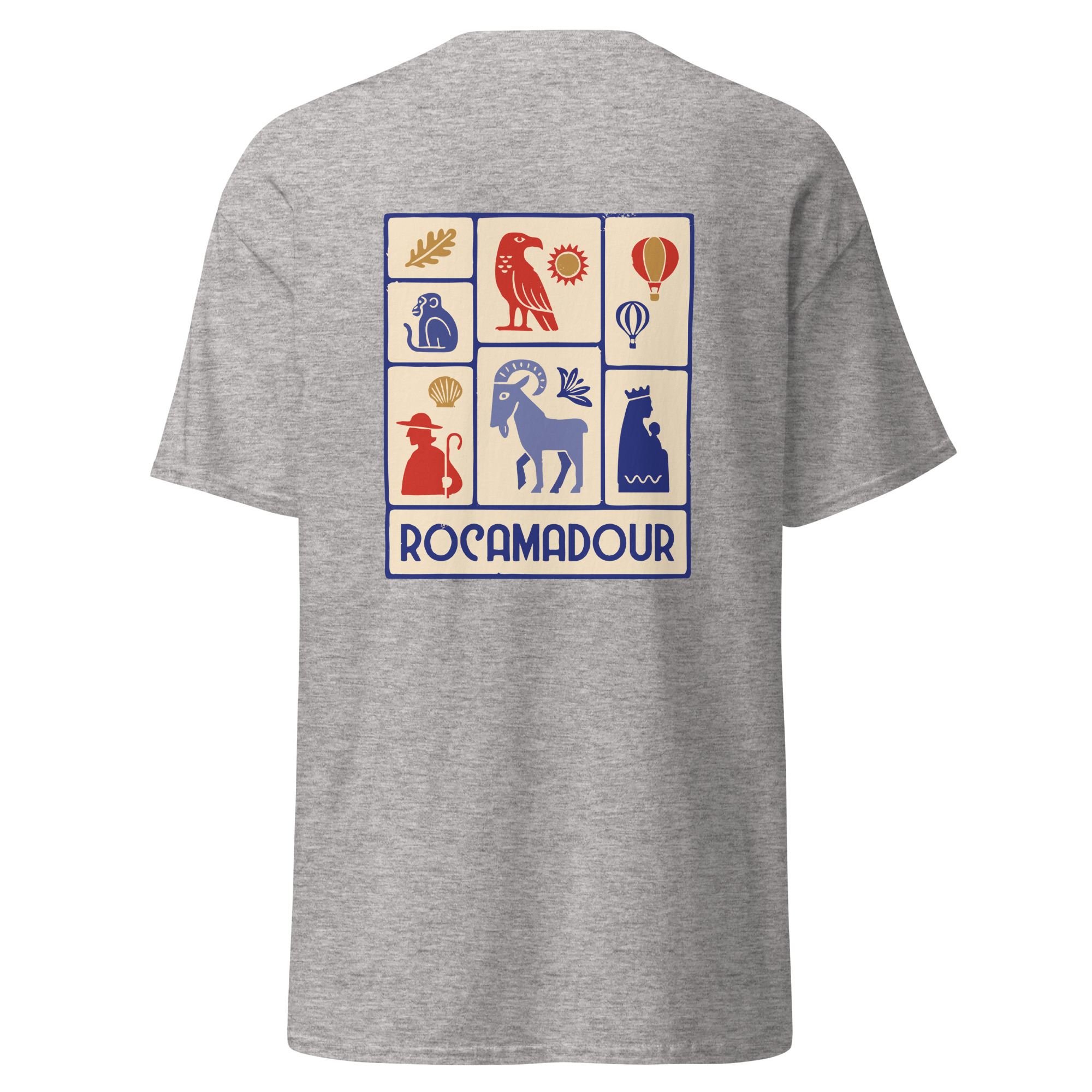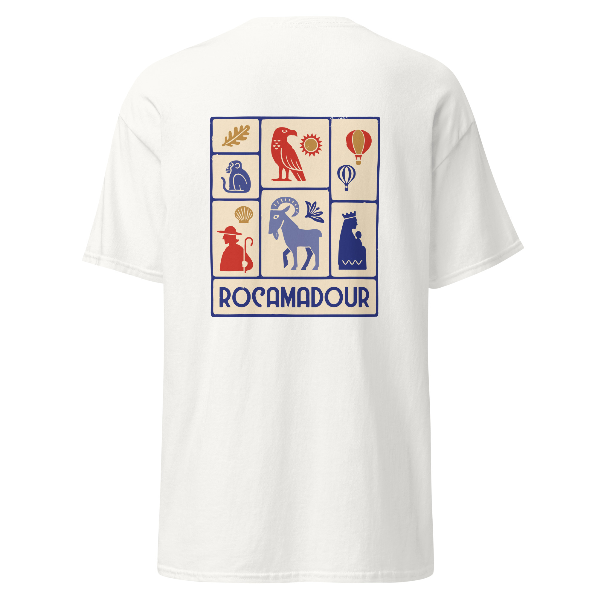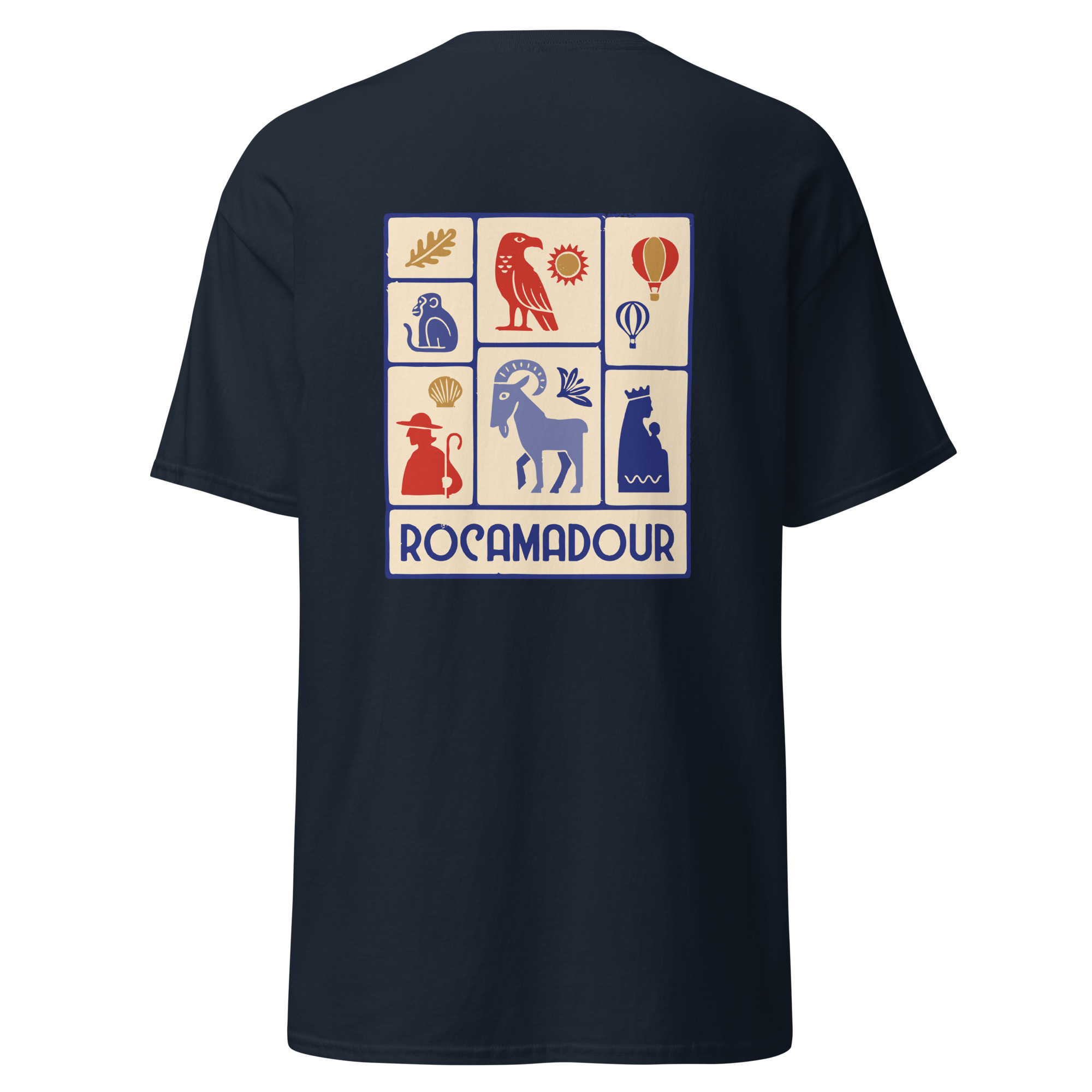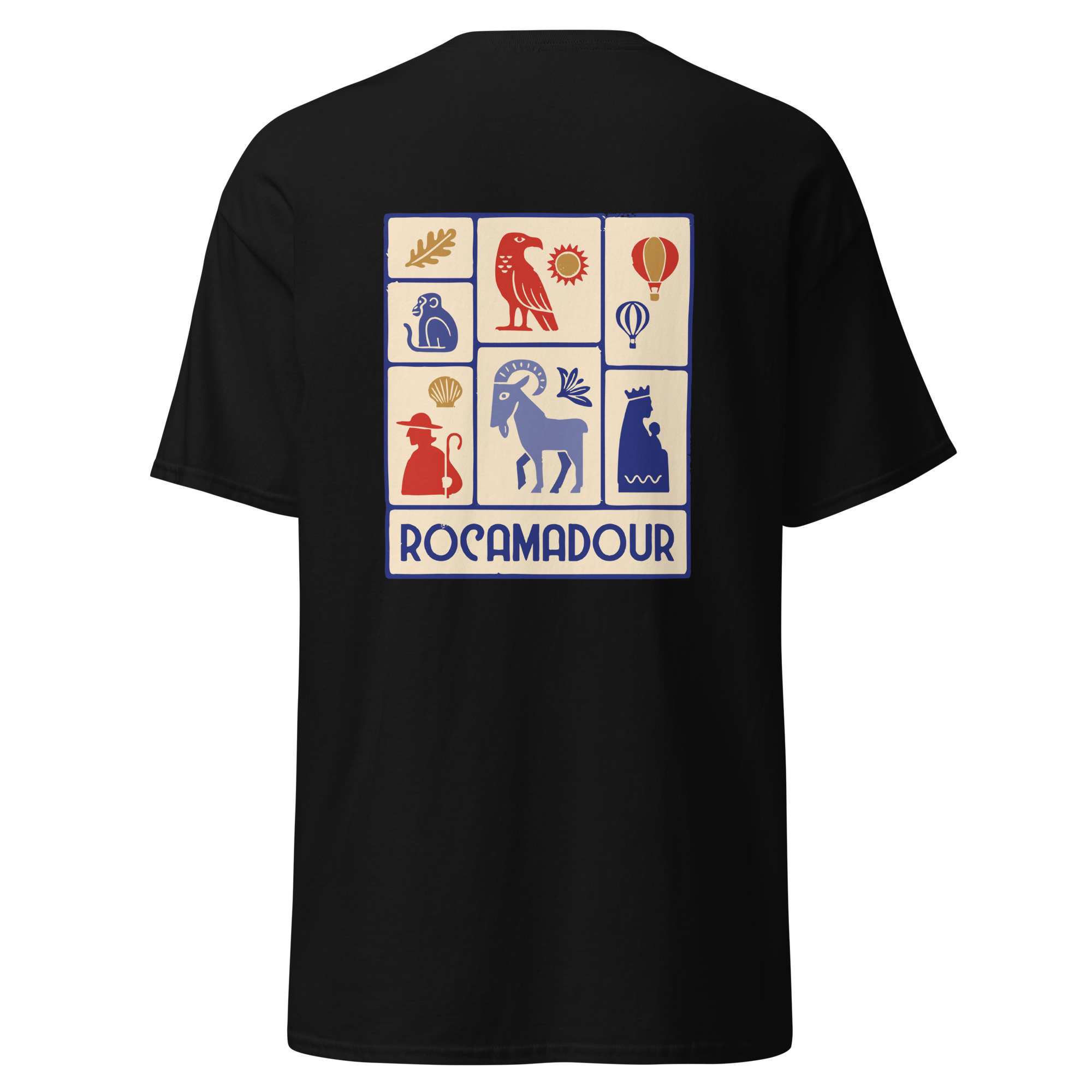 Ce visuel rassemble les symboles de Rocamadour (Lot, Occitanie) : pèlerin de Saint-Jacques-de-Compostelle, chèvre du Quercy, Vierge noire, singe de la Forêt des Singes, aigle du Rocher des Aigles et montgolfières des Montgolfiades. Composition inspirée des motifs artisanaux.